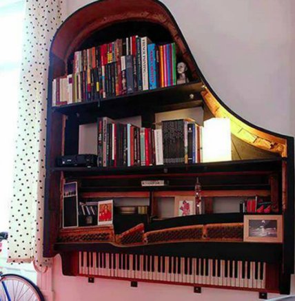 Основание ненужного рояля подойдет для создания большого настенного стеллажа. Такая переделка поможет освободить место в комнате и станет отличным украшением комнаты.