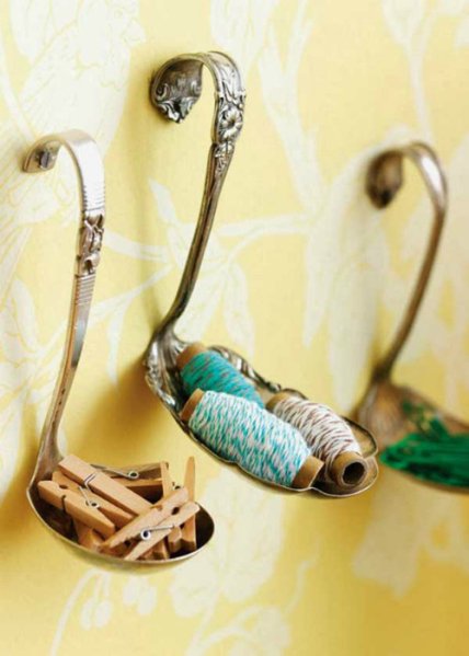 Металлические ложки, вилки и даже гаечные ключи можно использовать для создания всевозможных крючков и держателей. Например, прикрепленные к стене ложки прекрасно подойдут для хранения ниток, иголок, булавок, заколок и украшений.