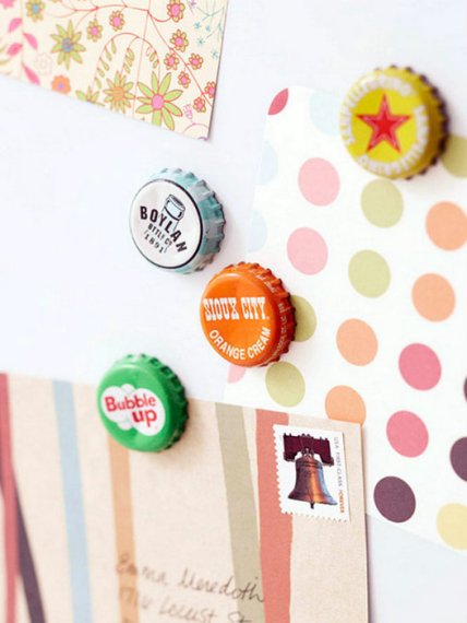 Металлические крышки от стеклянных бутылок с напитками, можно использовать для создания оригинальных магнитов. Такие магниты украсят фасад холодильника и разбавят приевшуюся картинку сувениров из путешествий.