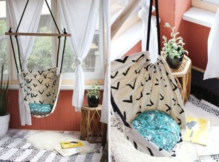 Комфортный гамак, пошитый из плотной ткани, выдержит вес взрослого человека. Главное — надежно зафиксировать крепления на потолке.