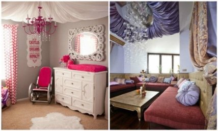 Декорировать потолок текстилем — нестандартное решение, которое кардинально преобразит любой интерьер. Не забудьте позаботиться о том, чтобы ткань легко снималась для стирки.