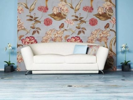 Акцентная стена, оформление которой отличается от других стен — отличный способ оживить интерьер. Обстановка станет вдвойне оригинальнее, если для декора использовать тканевое полотно, натянутое на большую раму.