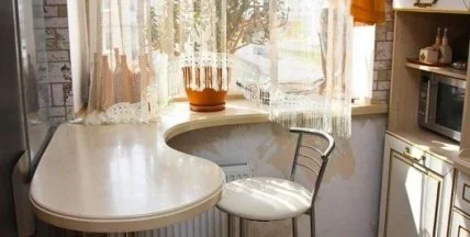 Для больших семей подойдет другой оригинальный вариант. Нужно, чтобы столешница обеденного стола плавно перетекала в столешницу на подоконнике. Таким образом, вы объедините две функциональные зоны и увеличите количество посадочных мест.