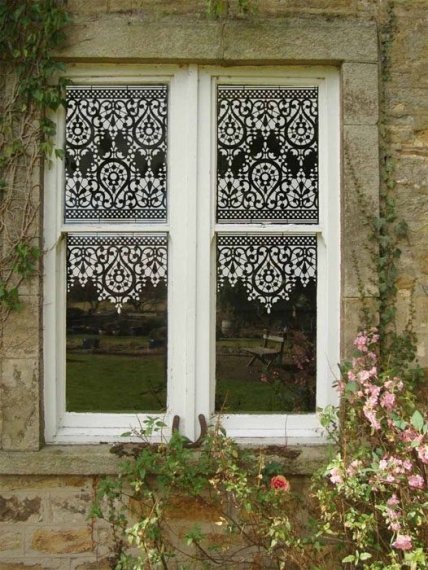 Не забываем про окна! Вместо того чтобы повесить на окна кружевные занавески или шторы, можно попытаться сделать трафарет и им декорировать стекла на окнах, как это сделали дизайнеры компании Design Inspiration.