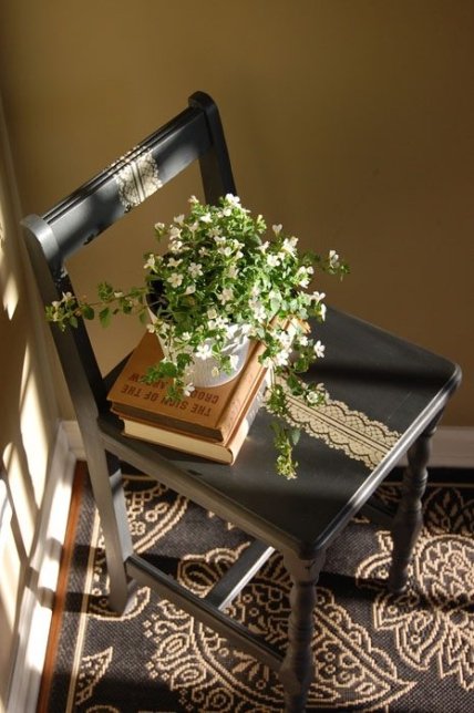 Также можно использовать яркие цвета для создания незаурядного вида мебели. Посмотрите, как обычное ничем не привлекательный стул от My Vintage Verve преобретает совершенно другой вид, благодаря кружеву и позолоченной краске.