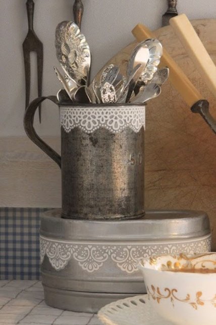 Но не надо и на этом останавливаться. Посмотрите, как с помощью кружева можно декорировать кухонную утварь, создав, казалось бы, обычным предметам новый и интересный образ.