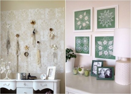 Если есть всего лишь один небольшой фрагмент кружевной ткани прямоугольной формы, можно декорировать стену в необычный способ, создав, например, основу для того, чтобы вешать украшения. Кроме того, небольшие салфетки тоже смогут стать достойным способом декорировать стены. Можно просто повесить их на стену либо поместить в рамки и так украсить стену.