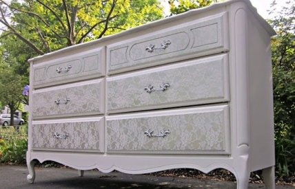 Кружеву можно найти массу применений в области декора, мебель не стала исключением. Кружево и краска – это все, что необходимо для создания эксклюзивного дизайна. При этом никакого особенного таланта не требуется. Посмотрите на этот изумительный комод, ящики которого декорированы кружевом, от компании Uniquely Chic Mosaics.