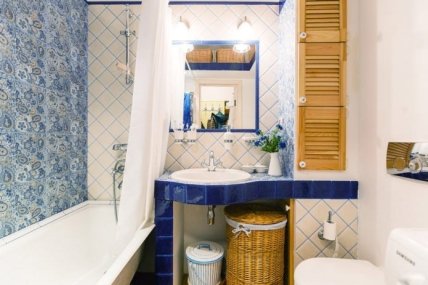 В дизайне маленькой ванной избегайте деления стен по горизонтали. Цветные или орнаментированные полосы лучше направить от пола к потолку выделив, например, зону установки туалета или "мокрую" зону. Не стоит выкладывать крупные узоры – это визуально уменьшит небольшую ванную.