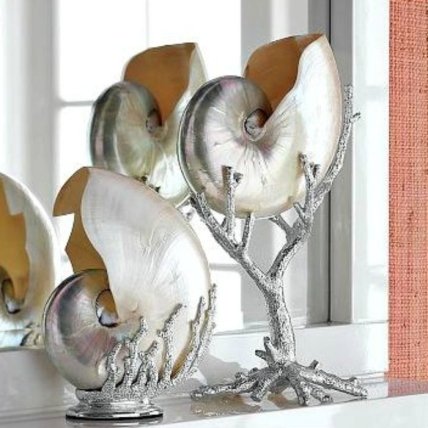 Великолепные предметы декора, которые можно сделать из крупных ракушек и веток, выкрашенных в серебристый цвет, станут уникальным украшением любого современного интерьера.