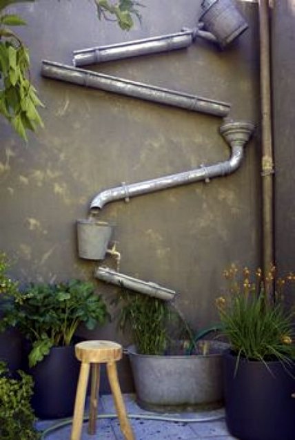 Забавный лабиринт, построенный на фасаде дома из кусков водосточных труб, позволит наблюдать за ручейками дождевой воды, стекающей в простое металлическое корыто.