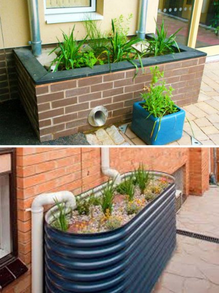 Большая цветочная клумба с влаголюбивыми растениями, построенная под водосточной трубой - прекрасное решение, которое поможет решить проблему со сточными водами без больших финансовых вложений.