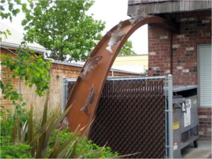 Необычный выгнутый водосток, декорированный металлическими фигурками рыб, станет не только функциональной деталью водосточной системы, но и настоящим украшением ландшафта.