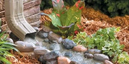 Большая цветочная клумба с влаголюбивыми растениями, построенная под водосточной трубой - прекрасное решение, которое поможет решить проблему со сточными водами без больших финансовых вложений.