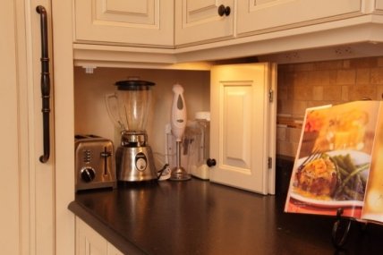 В нише хорошо смотрятся полки, а если добавить еще и дверцы, получится компактный шкаф. В углублении, расположенном на уровне рабочей поверхности, удобно хранить блендеры, кофеварки и тостеры. Закрыв его шторкой или складной ставней в цвет гарнитура, вы сохраните стилевое единство помещения. А если размеры ниши и кухни позволяют, то можно сделать настоящую кладовую со всеми необходимыми ящиками и полочками, а для экономии пространства снабдить ее раздвижными дверками.