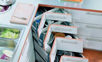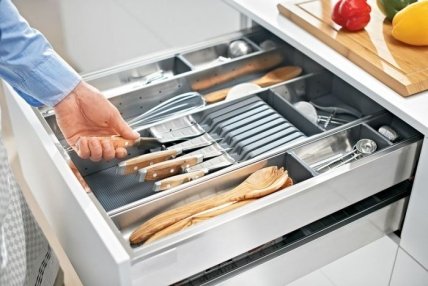 Первым делом нужно позаботиться о том, чтобы ящики выдвигались максимально далеко: так всегда видно, что там лежит, и легко достать содержимое. Для столовых и кухонных приборов лучше приобрести лотки с отделениями, причем нужно позаботиться, чтобы они регулировались точно под ваши нужды. А если каждый нож будет лежать отдельно, их нужно будет реже точить.