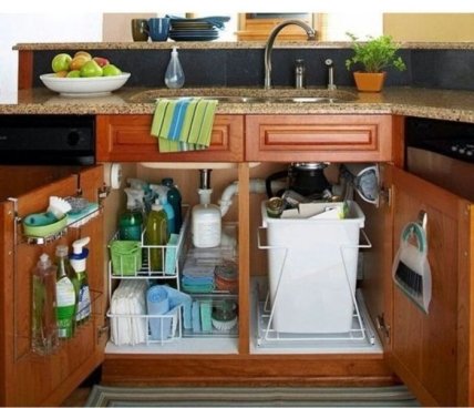 В нижних шкафах удобно размещать крупную бытовую технику, большие кастрюли. На дверцы снаружи подвесьте пару небольших открытых контейнеров - туда удобно во время готовки смахивать очистки прямо со столешницы. Кстати, ведра для мусора можно сделать выдвижными – так гораздо удобнее вытаскивать полные пакеты и вставлять новые. Или, например, вообще можно оборудовать для них отдельный ящик, а не ставить под раковину. А под ней устроить удобные полочки, а изнутри на дверцы прикрепить держатели для губок, тряпок, щеток и бытовой химии.