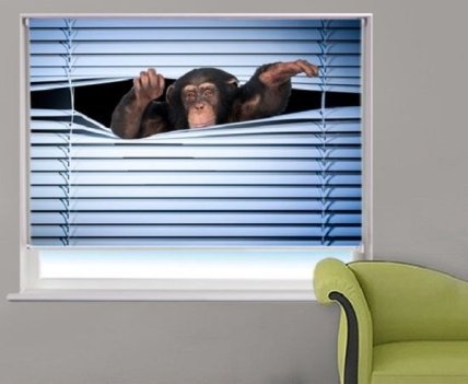 Нет, это не настоящая обезьяна заглядывает к вам в окно, это рулонная штора, на которой она изображена. Со временем впечатление от обезьяны может сойти на нет, но сначала она будет веселить.