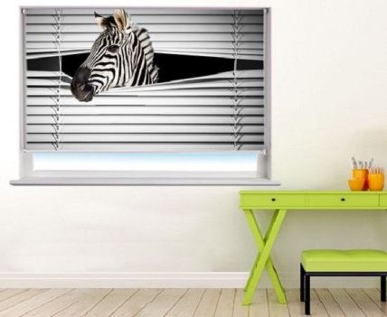 Как и в случае с обезьяной, на этих шторах сквозь жалюзи выглядывает зебра. Но, конечно, это всего лишь картинка, и в этой немного больше вкуса, чем в обезьяне.