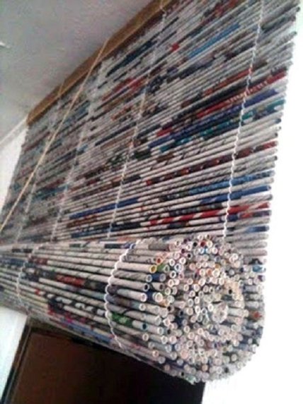 Хотите верьте, хотите нет, но эти рулонные шторы - не более чем куча старых газет! Потребуется достаточно времени, чтобы свернуть достаточно газет для шторы, но, наверняка, это отличная идея повторного использования старых газет.
