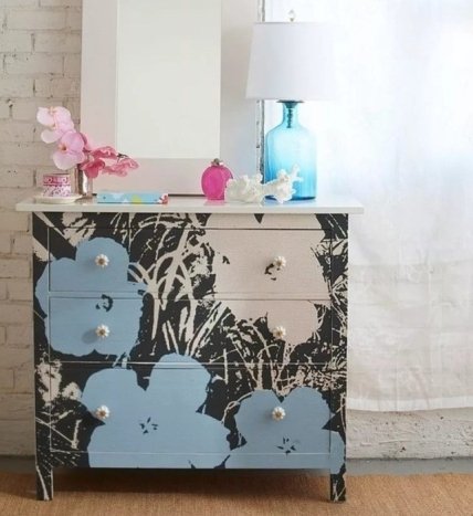 Даже при отсутствии развитых навыков в сфере изобразительного искусства получится декорировать старую мебель подобным образом. Выберите простой рисунок в двух-трех цветах и перенесите его на поверхность мебели, заранее окрашенную в выбранный основной цвет.