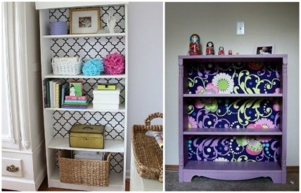 Эффект неожиданности при разглядывании мебель, задняя стенка которой украшена яркими узорами, гарантирован. Если позволяет уровень собственных художественных навыков, то заднюю стенку можно разрисовать. Для этого придется предварительно разобрать мебель. Существует и более простое решение: просто обклейте ее яркими обоями. Для того чтобы обновление было целостным, окрасьте и саму мебель в гармонирующий цвет.