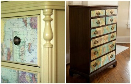 Наверняка в каждом доме найдутся старые географические карты, оставшиеся со школьных времен. Ими можно полностью оклеить мебель, воспользовавшись описанной выше техникой декупажа. Если такое решение кажется слишком радикальным, то лучше совместить декупаж с окрашиванием отдельных участков. Чтобы краска легла ровно, необходимо очистить мебель от старой отделки.