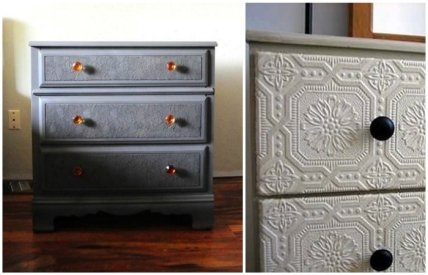 Обои с выпуклыми узорами под покраску — отличный материал для обновления мебели, покупка которого не обременит даже самый скромный бюджет. Проверьте дальние ящики: возможно, остатки обоев после ремонта ждут своего звездного часа. Наклейте отрезки обоев на подготовленную и очищенную поверхность мебели. Если белый цвет кажется слишком скучным, то окрасьте обои и покройте их лаком для защиты.