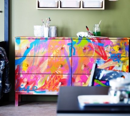 Множество ярких красок, даже не сочетающихся между собой — это все, что понадобится для преображения мебели в образец абстрактного искусства. Очистите мебель от старых лака и краска, загрунтуйте. Затем начинайте покрывать ее небольшими мазками разного цвета. Для удобства вначале нанесите первый цвет, затем второй и так далее. Чтобы оценить сочетаемость цветов, рекомендуем предварительно создать эскиз на куске плотного картона.