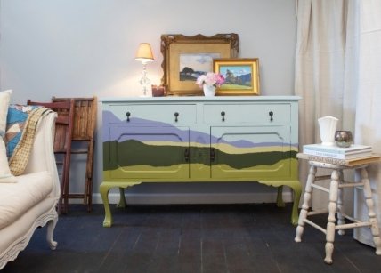 В это сложно поверить, но для того, чтобы нарисовать интересный пейзаж, не нужно быть художником. Главное — правильно подобрать цвета и нанести их в виде неровных полосок на поверхность выбранной мебели. В таком абстрактном рисунке любой желающий без труда узнает горный пейзаж.