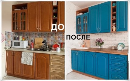 Заменить все кухонные шкафы, которые уже порядком надоели, будет стоить недешево. Не сильно много вы сэкономите и в том случае, если захотите поставить новые цветные дверки, а каркас оставить прежним. Самым экономичным, простым и быстрым вариантом будет самостоятельно выкрасить дверцы в контрастный цвет. Особенно эффектно это будет смотреться на фоне светлого интерьера. Например, если до этого у вас был белоснежный гарнитур и обеденный стол голубого оттенка, можно в такой же цвет покрасить и дверки. Тогда интерьер станет целостным и гармоничным.
