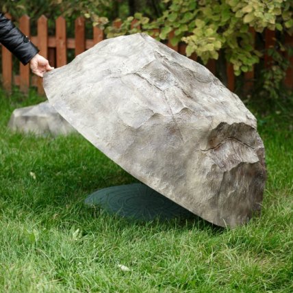 Такие композиции здорово смотрятся на фоне натуральной гальки или яркого цветника. Кстати, камни, уложенные на канализационные люки, вполне могут стать частью роскошной альпийской горки.