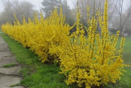 Одной из первых "просыпается" весной форзиция. На ее безлистных побегах распускаются желтые цветки-колокольчики. Ветви буквально усыпаны ими. По окончании цветения кустарник "переодевается" в светло-зеленую листву, которая осенью становится золотистой или багряно-фиолетовой.
