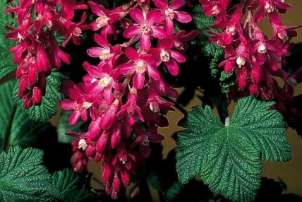 Этот необычный кустарник вырастает до 4 м в высоту (в культуре 1,5-2,5 м). Кроваво-красной смородину называют из-за красно-коричневых прямых побегов и розово-красных кистевидных соцветий. Молодые листья имеют насыщенный аромат.