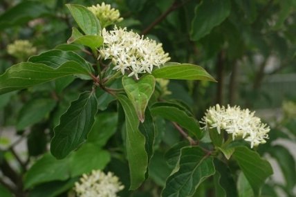 Цветет свидина в конце мая, а при хорошем уходе и в сентябре. Мелкие цветы собраны в пушистые почти плоские щитки диаметром до 7 см.