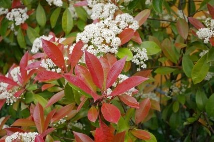 В мае-июне на фотинии распускаются большие белые зонтичные соцветия. Осенью на их месте созревают темно-красные плоды диаметром около 1 см, а листва становится оранжево-багровой.