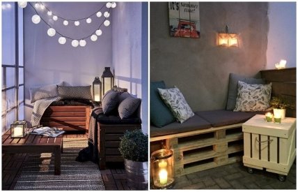 Чтобы проводить уютные вечера на террасе, нужно позаботиться о дополнительной подсветке, так как освещения смежной комнаты не хватит. Если свет уже выведен на балкон – прекрасно. Если нет – ничего страшного. Можно использовать обычные или электрические свечи, светильники, работающие от батареек. Еще одним великолепным вариантом станут гирлянды. Так как до Нового Года еще далеко, и украшать елку в ближайшем будущем не придется, вы смело можете повесить их на балконе до зимы и включать, когда нужно.