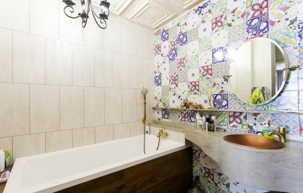 Возвращаясь к вопросу о плитке, предлагаем еще один вариант. Если прием с затиркой кажется вам неподходящим, а целиком выкладывать стену, пол или фартук яркой плиткой вы не готовы, обратите внимание на следующий способ отделки. Подберите к основной плитке нейтрального оттенка яркую мозаику-компаньон. Например, если в ванной комнате стены имеют нежно-голубую цветовую гамму, добавьте в общую картинку несколько насыщенно-синих плиток. Они не испортят композицию, не создадут эффект перебора, но будут привлекать к себе внимание.