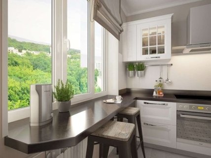 Если вам повезло стать обладателем кухни, окна которой выходят не на мрачный соседний дом, а на прекрасный город, то воспользуйтесь подарком судьбы и сделайте из подоконника барную стойку. Так вы сможете одновременно и наслаждаться прекрасным видом, и пить кофе, обедать либо работать. Опять же таки, данный подход поможет сэкономить место в кухне, так как барная стойка выступит и обеденной зоной. По информации Novate.ru, дизайнеры советует при выборе материала остановиться на камне либо натуральном дереве, так как отличаются надежностью и безопасностью.