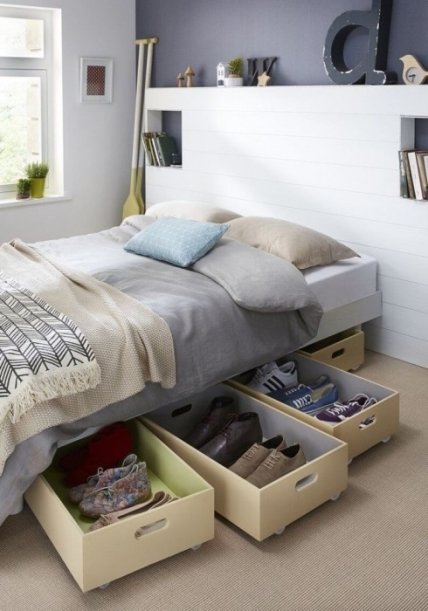 Если у вас нет подъемного механизма, в кровати не предусмотрены ящики для хранения и в кладовке не завалялись пустые коробки, в которые можно положить вещи, значит не стоит ничего хранить под кроватью. Предметы, которые просто будут лежать на полу, даже если вы предварительно приведете его в порядок, все равно будут собирать много пыли. Исключением является ситуация, когда предметы находятся в оригинальной заводской упаковке. Например, вы можете хранить под кроватью бытовую технику, которую вам подарили, но она не пригодилась, новую обувь и пр.