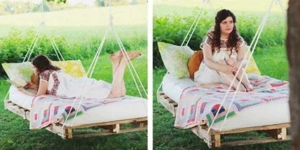 Как вы уже поняли, поддоны – один из самых ходовых материалов для создания качелей. Из них запросто можно соорудить конструкцию на любой вкус: от классической качели-скамейки, как показано на фото, до комфортабельной качающейся кровати и не только. А разбавить обстановку можно с помощью различного рода светильников и декоративной садовой мебели, выполненной из сподручных средств.