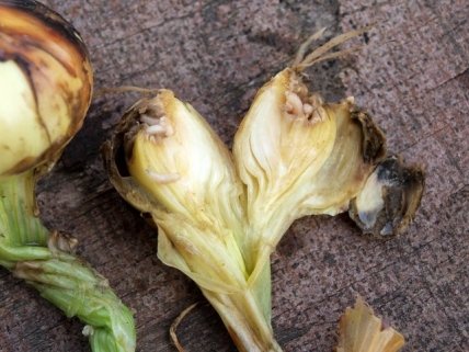 Пораженные гнилью или ржавчиной луковицы следует удалять или сжигать, пока болезнь не распространилась на всю гряду.