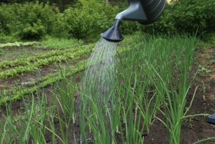 Если желтеют нижние листья у лука, вероятнее всего, дело в недостаточном или нерегулярном поливе. Лук очень любит воду, особенно теплую, а от ее нехватки страдают не только перья, но и луковицы. Чтобы не плакать от слишком "злого" урожая, в первой половине лета поливайте лук 2 раза в неделю из расчета 8 л воды на 1 кв.м. Проводить полив желательно утром, водой не холоднее 18°С. В жаркую погоду участите поливы, а после того как верхний слой почвы подсохнет, слегка прорыхлите посадки.