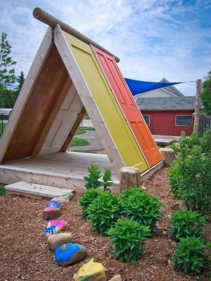 Необычная беседка получится из старых дверей, а если выкрасить двери в яркие цвета, то такая беседка станет еще и оригинальным украшением сада.