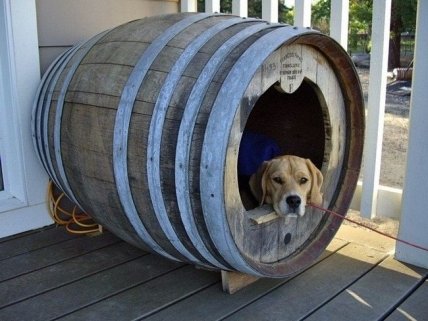 Из деревянной бочки получается необычная и уютная будка для четвероногого друга.