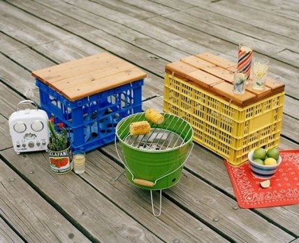 Сделать удобные скамейки для пикника на даче можно из старых ящиков, а ведерко легко можно превратить в небольшой мангал.