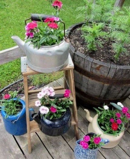 Превратите старую посуду в оригинальные горшки для цветов, которые станут «изюминкой» ландшафтного дизайна.