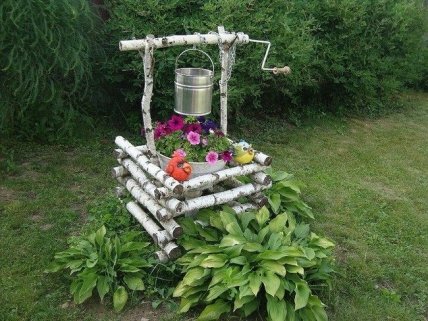 Для оформления колодца отлично подойдут толстые ветки, а для того, что оригинально замаскировать отверстие колодца используйте переносную клумбу в ведерке.
