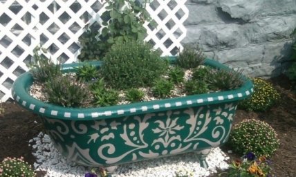 Благодаря большой глубине в ванне можно выращивать даже крупные растения — объемная корневая система уместится в ней без труда. Чтобы грядка выглядела еще декоративнее, на внешней поверхности ванны можно нарисовать узоры или же окрасить ее в выбранный цвет целиком. Также доступно несколько вариантов размещения. Ванну можно как просто поставить на землю, так и частично или полностью вкопать ее в грунт.