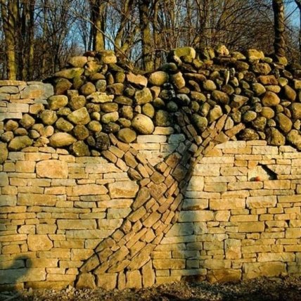 Ограда из камня красива сам по себе, но можно еще больше усилить эстетику, выложив какой-то рисунок. К примеру, несложно будет изобразить дерево. Или фигурно выложить камни, создавая эффект плавности линий.